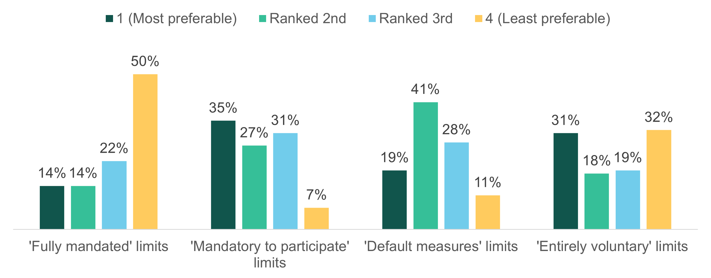 When asked to rank these types of limit in order of preference, over one third of respondents chose ‘mandatory to participate’ as their most preferred option, followed by 31 percent selecting ‘entirely voluntary’ as their most preferred option. 50 percent of respondents chose ‘fully mandated’ as their least preferred option, followed by 32 percent selecting ‘entirely voluntary’ as their least preferred option (see Chart 1.1).